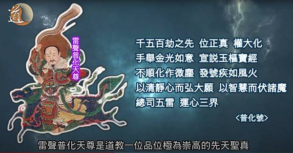 九天應元雷聲普化天尊,悉得解脫。於是雷師皓翁,對天尊前而說偈曰:無上玉清王,統天三十六,九天普化君,化形十方界,披髮騎麒麟,赤腳躡層冰,手把九天氣,嘯風鞭雷霆,能以智慧力,攝伏諸魔精,濟度長夜魂,利益於眾生,如彼銀河水,千眼千月輪,誓於未來世,永揚天尊經。
