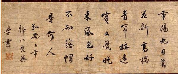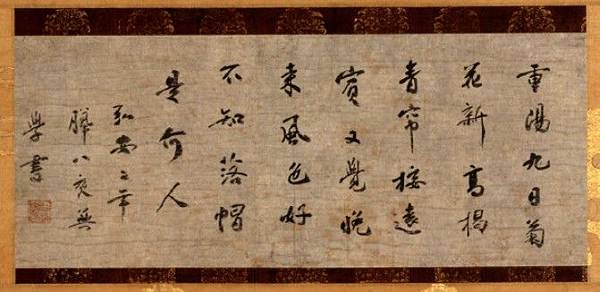宋代臨濟宗高僧無學祖元禪師是日本北條時宗自蘭溪道隆大師圓寂後,從中國恭請的又一位高僧。這首重陽上堂偈是1279年大師初到日本的當年,九月九日重陽節說法時所作,同年12月8日夜揮毫而就,留下了現在我們看到的這幅珍貴墨寶。