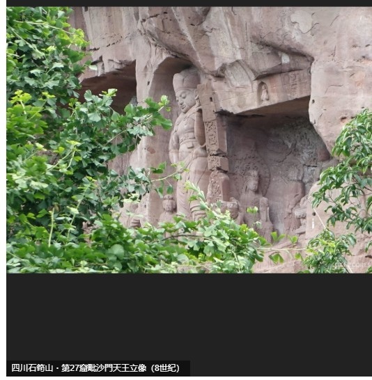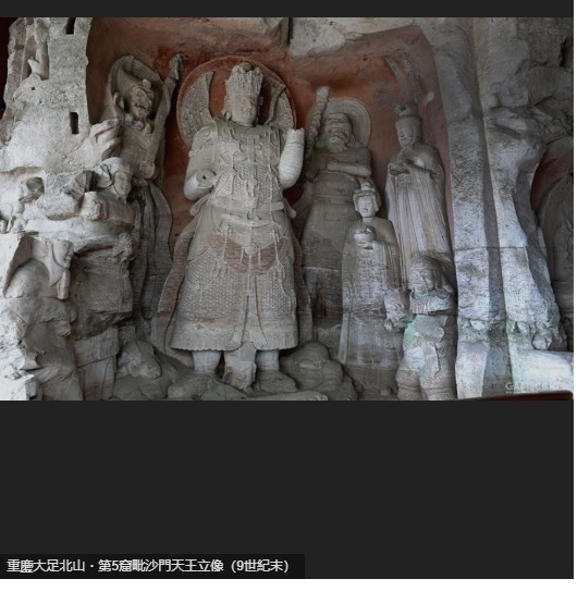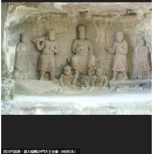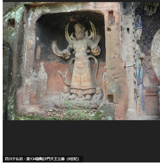 除了上述的龍興寺,在四川的廣大地界上大量分佈著毗沙門天王像,比如石筍山、千佛岩、重龍山、圓覺洞、以及現屬重慶的大足北山等,現今發現的大約有100尊左右。四川地區之所以誕生了作為主尊存在毗沙門天王像,西域的影響是切實不可迴避的。唐朝在8世紀與吐蕃的漫長戰爭中,毗沙門天王作為國境的守護神由西域直接傳入四川。也正是由於如此,由天竺傳入中原的多聞天王大多只是石窟的門番,而從西域而來的毗沙門天王作為獨尊的軍神確立於四川,不久後即傳入日本,由此落地生根。