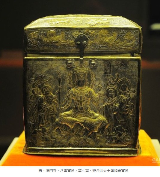 所謂「八重寶函」,即是像俄羅斯套娃一樣,一層套一層的七個盒子和最裡面的寶塔,塔中供奉著佛祖釋加牟尼佛指舍利的一個影骨(即玉石製成的捨利仿製品)。在第七重・鎏金四天王盝頂銀寶函上,鐫刻著穿著唐代武將盔甲,早已世俗化的四大天王。其中多聞天王被叫做為「北方大聖毗沙門天王」,語出後秦弘始十五年(413年)被漢譯的《長阿含經》。