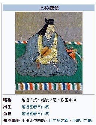 上杉謙信(1530年2月18日-1578年4月19日)是一名活躍於日本戰國時代的大名,後世譽為越後之虎、越後之龍、戰國軍神。越後守護代長尾為景幼子,幼名「虎千代」,成年後稱長尾景虎。