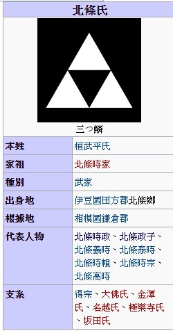 北條氏是日本鎌倉幕府的執權(實質為幕府的最高執行人),伊豆國的貴族,自稱出自平高望。自從協助源賴朝消滅平氏,自第二代北條義時執權起,便掌握了鎌倉幕府的實權,之後每代以不同的手法使幕府將軍下台,其後更使親本成為了將軍。第八代執權北條時宗曾應付元朝的入侵。第九代執權北條貞時在平禪門之亂消滅了內管領平賴綱(他是時宗心腹)。