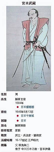 宮本武藏是日本戰國末期至江戶時代初期的劍術家、兵法家、藝術家。因與佐佐木小次郎決戰而一舉成名。日本是一個崇尚武力、崇尚刀劍的民族,宮本武藏在日本的影響相當大,以致有「真田(幸村)的槍、宮本的刀」的說法。劍術以外還是手裏劍和體術等多種多樣武術的高手,二十來歲已經開創一派號稱「圓明一流」。