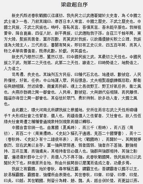 在《中國之武士道》的《自序》中,梁氏首先解釋他為何起題:“泰西日本人常言,中國之歷史,不武之歷史也;中國之民族,不武之民族也。嗚呼!吾恥其言,吾憤其言,吾未能卒服也。”他認為自黃帝以來,華夏民族就是靠武力征服夷蠻在這廣博的土地上生息繁衍,並且自有正史開始的五百年間,卓越的尚武人物不計其數,他從“穆然以思”得出這樣一個結論“中國民族之武,其最初之天性也;中國民族之不武,則第二之天性也。”形成這第二天性是時勢、地勢、人力造成的。