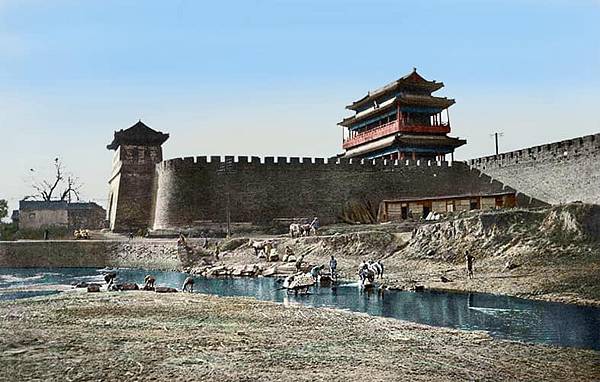1910年代,永定門位於北京城中軸線的最南端,是明清北京外城城牆的正門,也是從南部出入京城的通衢要道。永定門始建於明嘉靖三十二年(1553年),寓意“永遠安定”。城樓形制一如內城,重簷歇山三滴水樓閣式建築,灰筒瓦覆頂,面闊五間。永定門甕城城牆於1950年開始被陸續拆除,1957年又拆除了城樓和箭樓。2004年北京永定門城樓複建,其中甕城和箭樓尚未修建。