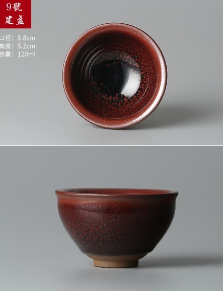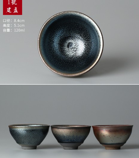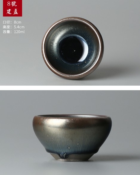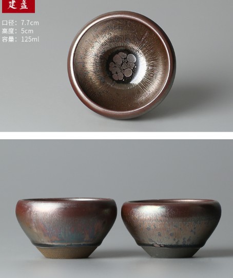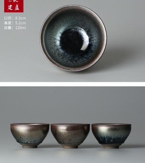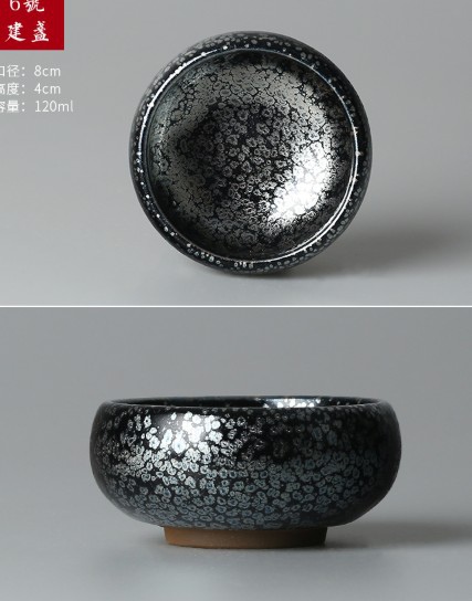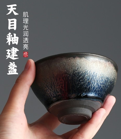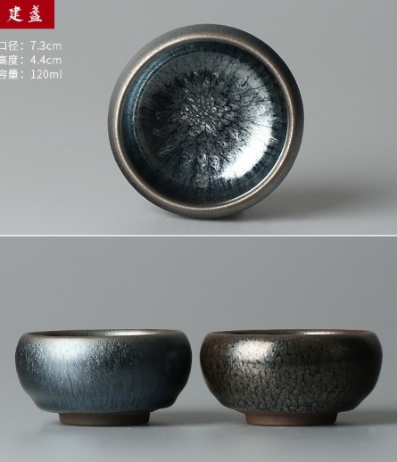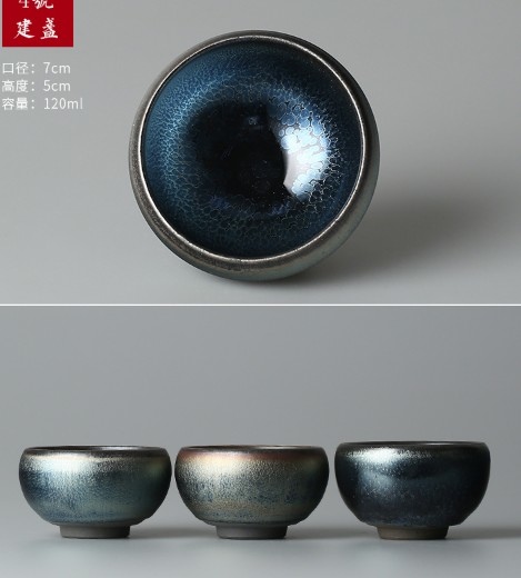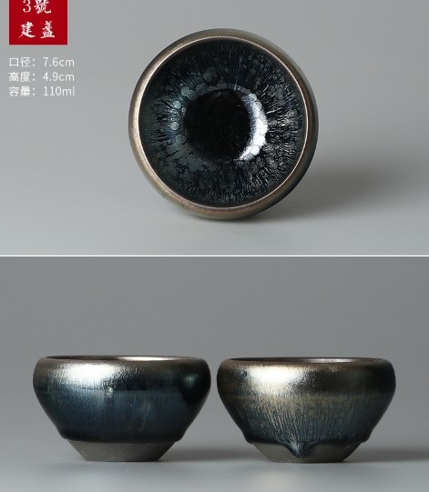 建盞還有一種珍稀極品的窯變盞,日本稱「曜變盞」,可惜目前在中土、在台灣都沒有存留了。在南宋時從日本入中土的禪僧帶回去的「曜變盞」,至今完好流傳下來三個,都被指定為國寶級的寶物。「曜變盞」是黑釉窯變後的異彩奇珍,茶盞上凝結了不規則的圓圈紋彩,耀如天宇中的群星,其周圍煥發出星辰般的幽光,尤其在光線的照射下,可能幻化出金銀藍等多彩光芒。日本16世紀的古籍,介紹收藏鑑賞中國繪畫藝品的專書——《君台觀左右帳記》描述「曜變」是「建盞內無上之品」。