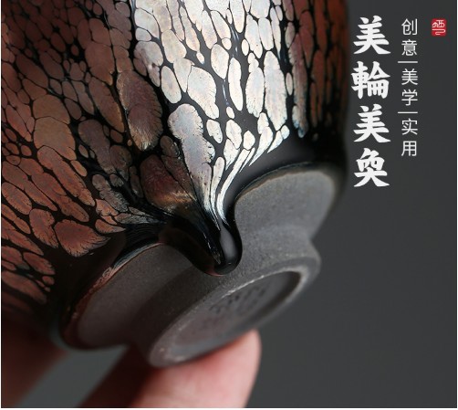 宋徽宗說的「盞色貴青黑,玉毫條達者為上」就是指窯變的「兔毫盞」,它是在青黑的釉彩上展現出兔毫一般千絲萬縷的柔絲紋,更像是十方迸射的靈光,凝凍於瞬間,成為永恆的神采。兔毫的顏色以棕兔毫較多,還有金兔毫、銀兔毫、藍兔毫等;兔毫紋從盞口縱貫整個盞壁,直達盞底是其中的珍品 。