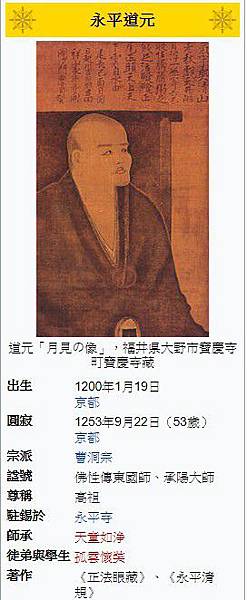 道元禪師(どうげん,1200年-1253年),日本鎌倉時代著名禪師,將曹洞宗禪法引進日本,為日本曹洞宗始祖。為永平寺住持,人稱永平道元。晚年自號希玄,故又稱希玄道元。謚號佛性傳東國師、承陽大師。