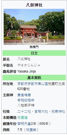 八坂神社(やさかじんじゃ),日本全國約有3,000多間,其位於京都的是八坂神社之總本社,因位於祇園,於是又名祇園神社(祇園さん)。[1]總本社位於日本京都府京都市東山區的神社。為二十二社,舊社格為官幣大社(現神社本廳的別表神社)。[2]