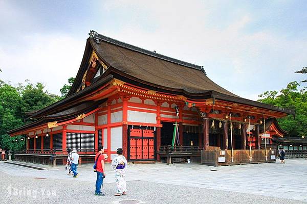八坂神社的建築為具特色的「祇園造」,指的是其神殿及拜殿雖分兩棟,但有同一屋頂。[3]