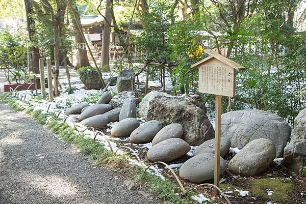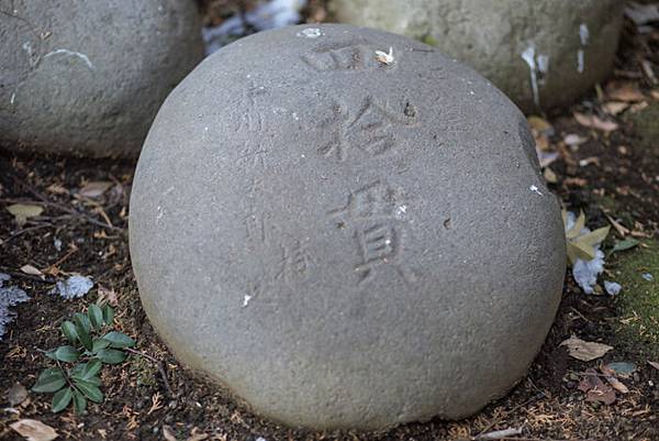 這邊這個是能量景點的「力石」。是在江戶時代,為了進行較力的祭神儀式而收到的奉納品。從27貫(101kg)到50貫(187kg),大大小小各式各樣的力石共有14顆。