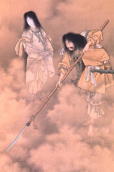 神世七代的後四代或五代都是一男一女的兩柱神。其中最引人注目的當然就是最後的伊邪那岐神(伊奘諾尊)和伊邪那美神(伊奘冉尊)了,這兩柱神在日本神話的地位相當於我們熟知的亞當與夏娃、伏羲與女媧。