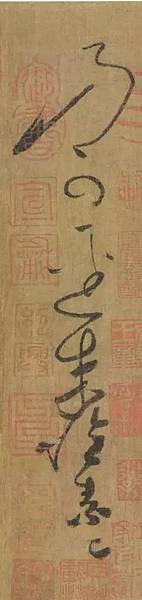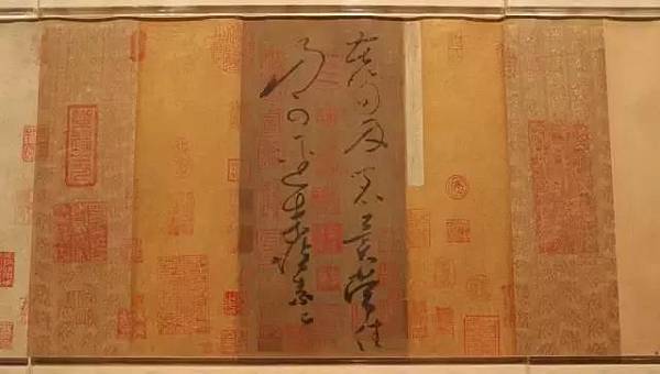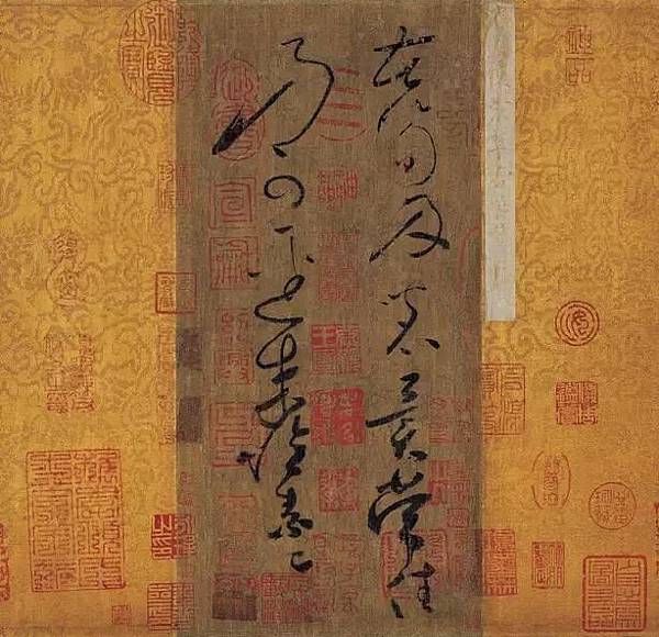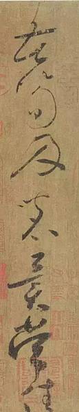 上海博物館珍藏的《苦筍帖》,是迄今傳世懷素作品中一件沒有爭議的真跡。此帖絹本,縱25.1厘米,橫12厘米。帖前乾隆引首「醉僧逸翰」四字;帖後有宋米友仁、聶子述,明項元汴,清李佐賢等題跋;又有宋「寶慶改元(1225年)九月九日重裝。松題記」款,據專家考證,應為《蘭亭續考》編者俞松所書。鈐有「紹興」「內府圖書之印」「歐陽玄印」,以及項元汴、乾隆內府諸印。