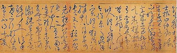 苦筍帖》,絹本墨跡,兩行十四字:「苦筍及茗異常佳,乃可徑來。懷素上。」翻譯成今天的語言就是說:「苦筍和茗茶兩種物品異常佳美,那就請直接送來吧。懷素敬上。」"剛挖了些苦筍,摘了些新茶,口感特別好,你趕快來。懷素敬上。"