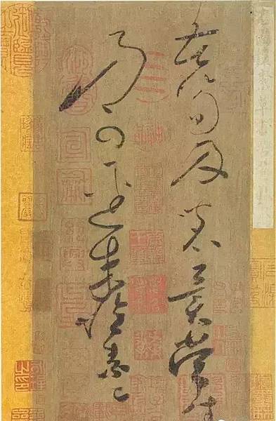 這幅《苦筍貼》雖然只有14個字,但是全帖"字字飛動,圓轉之妙,宛若有神"。近觀此帖,一字一句由淡到濃墨色分明,單純明朗,卻又盡顯奔流直下 的狂草書勢,尤其是後一行字,幾乎是一筆書成。