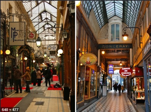 拱廊街(passage couvert) ,不過是「玻璃屋頂覆蓋下的通道」,只是為了連接道路與道路之間的通道,車輛無法進入,只開放給一般行人使用,並且是非居住者專用的私人土地,有屋頂覆蓋,屋頂材質或玻璃或塑膠,重點是透明,可以看見天空。