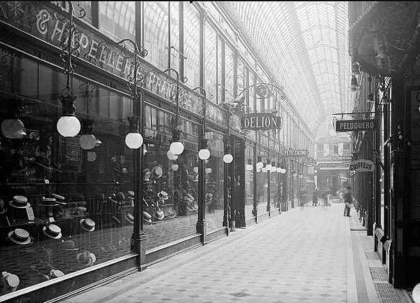 被視為現代商業中心始祖的「拱廊街」出現於十八世紀末的巴黎。「拱廊街」在法語裡被稱為「覆蓋式通道」。因為這些開闢於建築群當中的通道頂部都加蓋了足以取光又可防雨的玻璃。「覆蓋式通道」不僅是城市生活中之捷徑,有避免路人繞道之功,通道兩旁的店家更是裝潢氣派,商品精美。在一個沒有電燈與人行道的時代,不用擔心車馬、風雨、泥漿侵襲的拱廊街立刻受到市民的喜愛。成為聚會、閒逛的好去處。