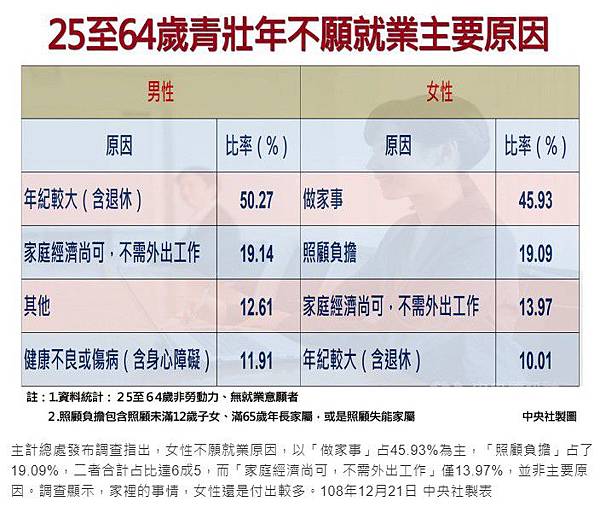 主計總處發布調查指出,女性不願就業原因,以「做家事」占45.93%為主,「照顧負擔」占了19.09%,二者合計占比達6成5,而「家庭經濟尚可,不需外出工作」僅13.97%,並非主要原因。調查顯示,家裡的事情,女性還是付出較多。108年12月21日 中央社製表