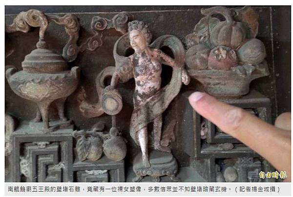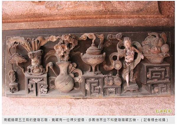 〔記者楊金城/台南報導〕有「台灣王爺總廟」稱譽的北門南鯤鯓代天府,在五王殿的壁堵石雕竟藏有一位裸女塑像,多數信眾並不知壁堵暗藏玄機,讓人好奇。