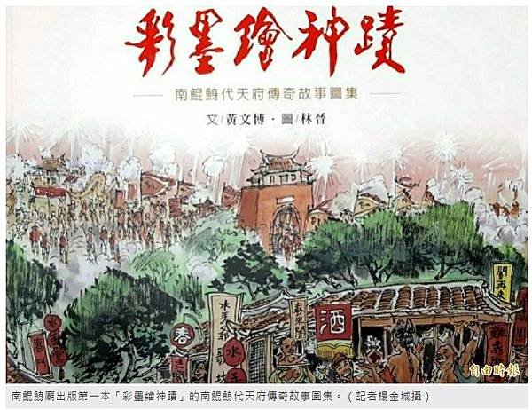 黃文博說,「彩墨繪神蹟」費時1年蒐集傳奇故事寫書,像南鯤鯓廟在清領到日治時代出巡府城時,因隨行遶境有大批轎班、藝陣人員,當時府城八大行業都拜「水手爺」,祈求遶境人員多多光顧,生意大發,因此有諺語:「水手爺腳蹺蹺,保庇大豬來進牢」。