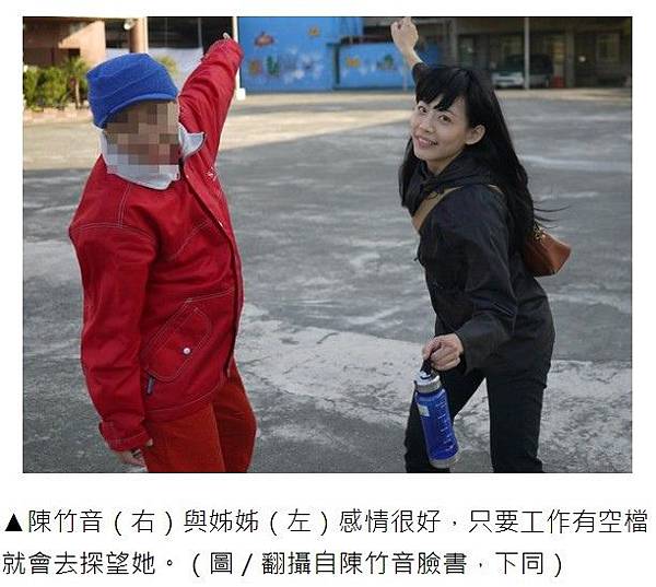 她的姊姊大她一歲,在15歲時精神分裂。我們跟著陳竹音到高雄龍發堂探望,姊姊看到我們隨即自我介紹:「你好,我是諾貝爾獎得主,我對醫學有很大的貢獻。」說完拉開袖子讓我們看手腕,「我是居里夫人,我在這裡種鬱金香。」陳竹音聽了苦笑:「她跟著爸爸,我跟著媽媽,爸爸娶第二任妻子是國小老師。如果成績不好,可能就被忽略,所以姊姊成績很好,她會講這些名人,可能期盼做很有成就的人吧。」