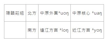 我們在〈比較法:中國篇〉提到漢語語音史有個世紀之謎,那就是陽韻莊組如何重建又如何演變的問題。從我們所建立的語言的連續性來看,陽韻莊組的邏輯過程可以分為四個階段:*ioŋ> yoŋ > uoŋ > uaŋ。其中前兩個階段見於南方,後兩個階段見於北方。第一個階段是唐代及更早時期北方漢語方言的共同形式;第二階段是宋代的發展;第三階段是元代的代表;第四階段是明清標準語的音讀模式。南方方言保存的*ioŋ 主要見於浙南和福建(廈門:狀ʦioŋ),其變體 oŋ(起於聲韻互動下介音消失)廣泛見於東南方言,