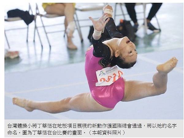 17歲體操小將丁華恬繼上月拿到2020年東京奧運門票後,近日再接獲捷報:她在地板項目改良的動作「丁丁跳」,獲國際體操總會(FIG)承認為新動作,並以「丁華恬」(Ting Hua-Tien)命名。