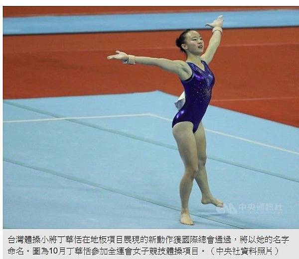 (中央社記者龍柏安台北26日電)身為台灣近51年來首名摘下奧運門票的女將,台灣體操小將丁華恬又有新壯舉,年初世界盃墨爾本站的地板項目,她展現改良後的新動作獲國際總會承認,將以她的名字來命名。