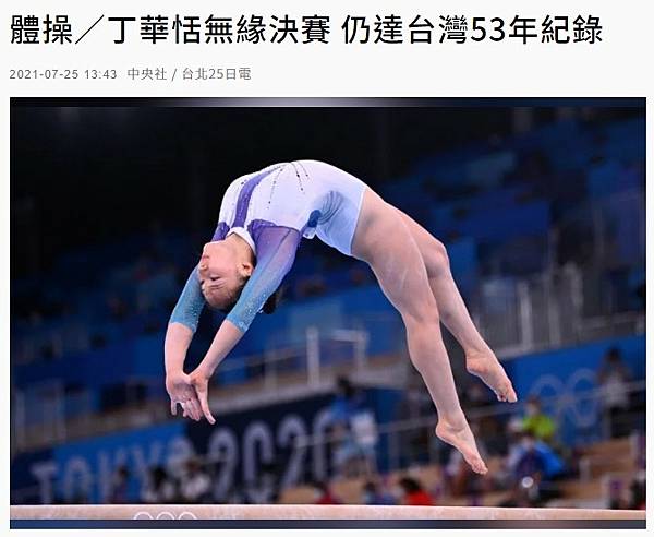 今天身為本屆台灣女子體操唯一代表成員,丁華恬因腰傷在身,決定放棄跳馬和地板,專拚平衡木以及高低槓,今天第一組出場,先比高低槓獲得12.233分,暫時在單項排名第6,隨後雖然在拿手的平衡木不慎失誤掉木,最後拿下12.566分,暫時在單項排名第9。體操/丁華恬無緣決賽 仍達台灣53年紀錄 | 中華隊出征東奧 | 運動 | 聯合新聞網 https://bit.ly/3x1vVUp