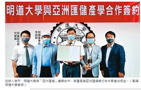 此外,明道大學祕書長詹國華強調,學校與「亞洲匯儲」是單純的產學合作、交流,並未違法招收中國學生。【明道大學涉詐欺3】董事長借1億給學校紓困 教育部打臉原因曝光 https://bit.ly/3ahgFJO