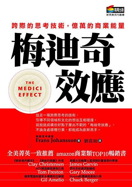 約翰森把交會點所發生的新構想層出不窮現象,稱為「梅迪奇效應」(Medici effect)──這個名詞源自在文藝復興時代的義大利,經營銀行業的梅迪奇家族,他們架構了一個有利各種活動進行的平台,促成創意勃發的現象。他在這本令人神往的書裡,說明如何在自己的生活中發現交會點,把我們找到的構想變成突破性的創新。約翰森認為,有三種動力──人口流動、科學學門整合以及電腦計算能力的躍進──使我們所能碰到的交會點數量和型態日益增多。