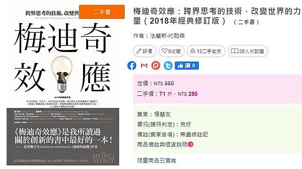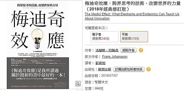 我不斷的在思考<梅迪奇效應>所帶給我的體悟,梅迪奇效應簡單來說是在強調異域碰撞,利用不同領域的組合,衝擊出新的創意。我們無法預期創意在什麼時候會出現,正如靈感不是你想要你就有,然而我們唯一能做的是:增加創意出現的機會。