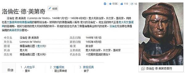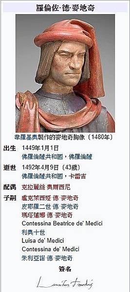 羅倫佐·德·麥第奇(義大利語:Lorenzo de' Medici,1449年1月1日-1492年4月9日)是一個義大利政治家,也是文藝復興時期佛羅倫斯共和國的實際統治者[1]。被同時代的佛羅倫斯人稱為「偉大的羅倫佐」(Lorenzo il Magnifico),他是外交家、政治家,也是學者、藝術家和詩人的贊助者。他生活的時代正是義大利文藝復興的高潮期,他的逝世也意味著佛羅倫斯黃金時代的結束。他努力維持的義大利城邦間的和平,但是隨著他的去世土崩瓦解。羅倫佐死後葬在佛羅倫斯的麥第奇家族墓地。 羅倫佐·德·麥地奇 - 維基百科,自由的百科全書