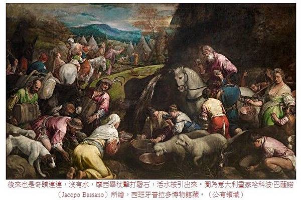 過紅海後,摩西領以色列人往前行,曠野行走三天都找不到水。後來找到的是苦水,不能喝,摩西尋求神的幫助,耶和華將一棵樹指給摩西,摩西把樹丟在水裡,水就變甜了。後來也是奇蹟連連,沒有水,摩西舉杖擊打磬石,活水被引出來;夜晚,有鵪鶉飛來遮滿了宿營,為以色列人補充肉類;清晨,天上降下白色嗎哪,滋味如同攙蜜的薄餅……