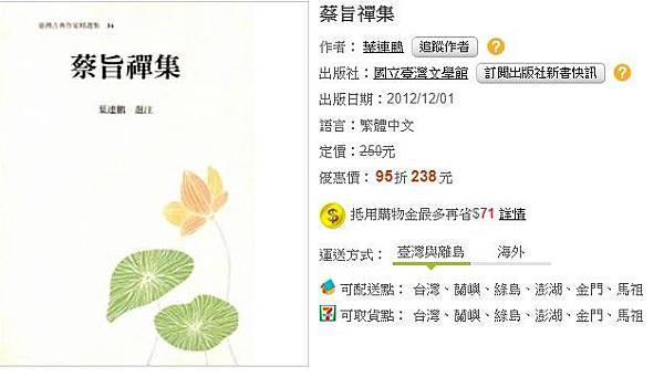 收錄台灣古典作家蔡旨禪作品 。蔡旨禪,名罔甘,字旨禪,道號明慧。澎湖人,日治時期著名古典詩人,自幼即長齋禮佛,為齋教先天派齋女,一生守貞不嫁,潛心修行。及長,從澎湖宿儒陳梅峰、陳錫如等攻讀漢學,以女性身分成為書房教師,是澎湖史有以來第一位女塾師。曾先後於澎湖、彰化、臺中霧峰、新竹等地任教,靠自己的力量奉養雙親,養活自己。具女性意識,極力提倡男女平權,為臺灣女權運動的先驅之一。師書畫皆擅長,被譽為「澎湖第一才女」。著有《旨禪詩畫集》。
