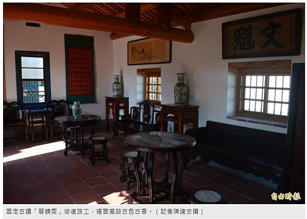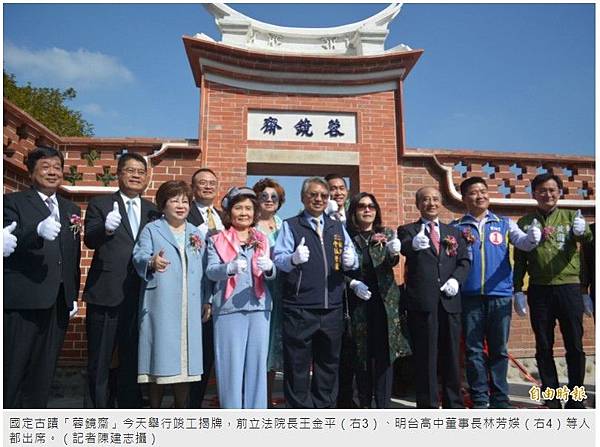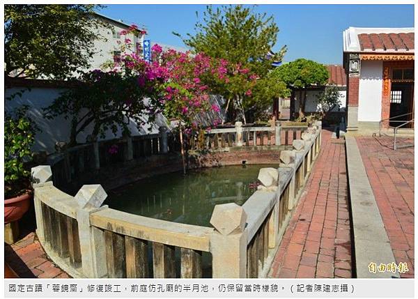 〔記者陳建志/台中報導〕興建於1887年的國定古蹟「蓉鏡齋」,過去是霧峰林家林文欽教育林家後代子弟所建的私家書院,建築風格嚴謹,採二進書院格局,前庭並有仿孔廟挖掘一個泮池(半月池),中央則是授業講堂,就連國學大師連橫都曾到這裡講學,因921大地震時嚴重受創,歷經2年重建,終於在今天舉行竣工揭牌典禮,未來將不定時舉辦藝文活動,並開放給民眾參觀,活化古蹟運用。