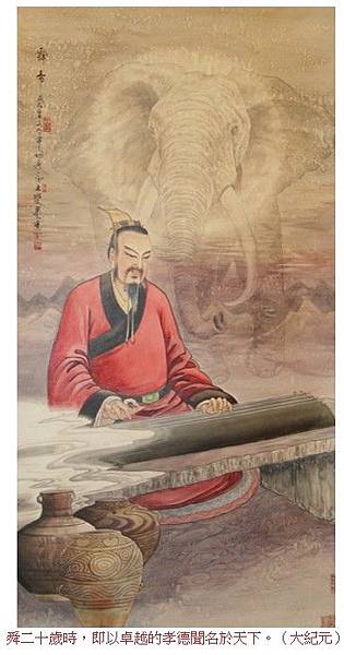 家人容不下舜,最後將舜趕出家門。舜漂泊在外,四處謀生。他曾在歷山下種田,在雷澤捕魚,在河濱做陶器,在壽丘做家具,在負夏做生意。舜二十歲時,即以卓越的孝德聞名於天下。天子堯帝有感於他的美德,將兩個女兒娥皇與女英嫁給他。或許出於某些原因,舜的父母對舜還有偏見,又比如距離遙遠,舜來不及稟報父親與繼母,天子就已賜婚了。後世孟子對此有了些許微詞,說「舜不告而娶為無後也」。實在冤枉舜帝了。