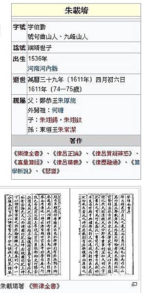 朱載堉(1536年-1611年),字伯勤,號句曲山人、九峰山人。明宗室鄭恭王朱厚烷嫡子,河南河內(今沁陽)人。為明仁宗第二子鄭靖王朱瞻埈之後,明太祖朱元璋的九世孫。明代樂律學家、音樂家、數學家、舞學家、樂器製造家、物理學家、天文學家、散曲作家,首創著名的十二平均律。西方人稱讚他為『東方藝術百科全書式的人物』。[來源請求]