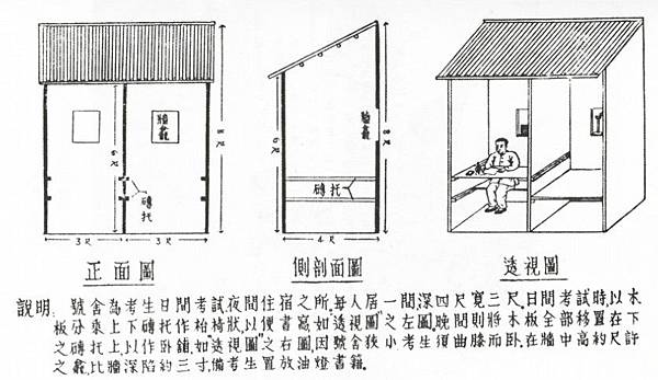 商衍鎏所繪的號舍正面、側面透視圖,可見當時士人在考場的情景。(圖出自商衍鎏《清代科舉考試述錄及有關著作》,天津:百花文藝出版社,2004,頁55)
