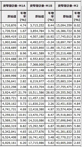 3.貨幣總計數M2=M1B+準貨幣(包括企業及個人在其他貨幣機構之定期存款、定期儲 蓄存款、外匯存款,郵政儲金總數,企業及個人持有其他貨幣機構之附買回交易餘額,外國人持有之新臺幣存款,以及兼營信託業務之銀行所發行之貨幣市場共同基金,但不包括銀行承做結構型商品所收本金 )。