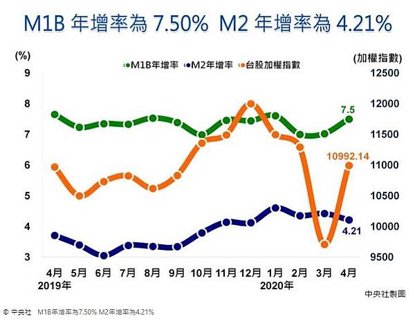 M1B年增率為7.50% M2年增率為4.21% https://bit.ly/3grc0qW