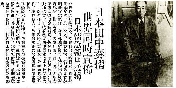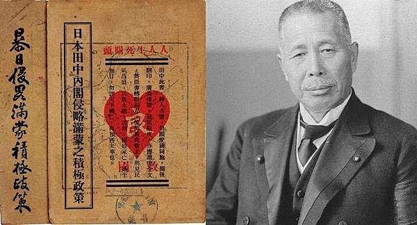 日本侵華陰謀藍圖──「田中奏摺」(原稱「田中奏章」),全名為:「對滿蒙積極政策奏章」,乃日本內閣總理大臣兼外務大臣、陸軍大將田中義一於1927年呈獻給裕仁天皇的奏章,其侵略野心昭然若揭書於其上: