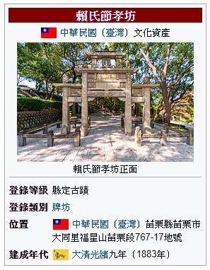 賴氏節孝坊位於臺灣苗栗縣苗栗市,於1985年8月19日公告為三級古蹟,後為苗栗縣縣定古蹟[1]。該牌坊原本立於苗栗文昌祠旁,後來遷移到天雲廟西側,最後移置到貓裏山公園內[2][3]。