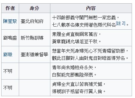 苗栗到了光緒十三年(1887年)才獨立設縣,當時仍歸新竹縣管轄。所以牌坊上才會有新竹縣訓導所寫的對聯,而石碑上則刻有「『臺北府新竹縣』貓貍街儒士劉金錫之妻賴氏節孝坊。 光緒九年。」的文字[3]。