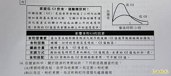 隨後題目提供的健康資訊圖表,教導考生GI(升糖指數)的概念,GI值越高,血糖上升的速度越快。綜合上述資訊,可以判斷陸游因太愛吃粥,不易控制血糖,因此有糖尿病等狀況。