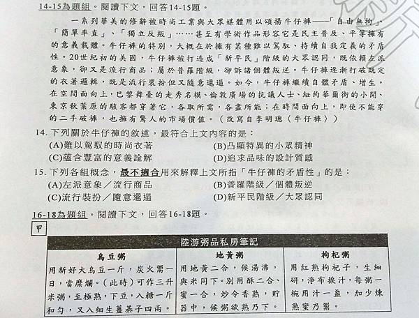 〔記者林曉雲/台北報導〕大學學測第二節國文科,題組考出愛吃粥的詩人陸游為什麼患有糖尿病和牙周病,題幹除了有陸游粥品的私房筆記烏豆粥、地黃粥、枸杞粥,還給升糖指數(GI)的圖表分析和食物GI因子,古文和白話文摻雜,從現代營養學角度幫陸游診脈;另也考出電影駭客任務題,乍看是電影駭客任務,但其實考題引用《當經濟指標統治我們》文章改寫,虛實互見也考驗學生的理解力,老師們都肯定出題精彩。