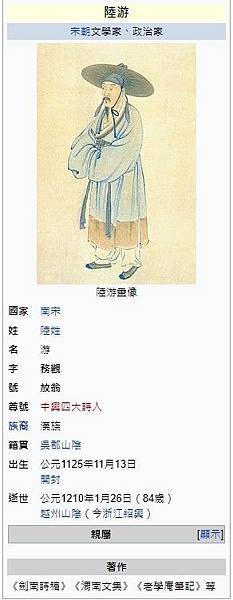 陸遊(1125—1210),南宋大詩人、大養生家、大壽星。字務觀,號放翁。漢族,越州山陰(今浙江紹興)人,南宋著名詩人。少時受家庭愛國思想薰陶,高宗時應禮部試,為秦檜所黜。孝宗時賜進士出身。中年入蜀,投身軍旅生活,官至寶章閣待制。晚年退居家鄉。創作詩歌今存九千多首,內容極為豐富。著有《劍南詩稿》、《渭南文集》、《南唐書》、《老學庵筆記》等。