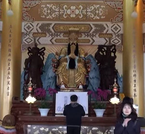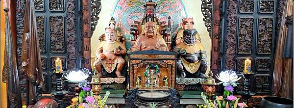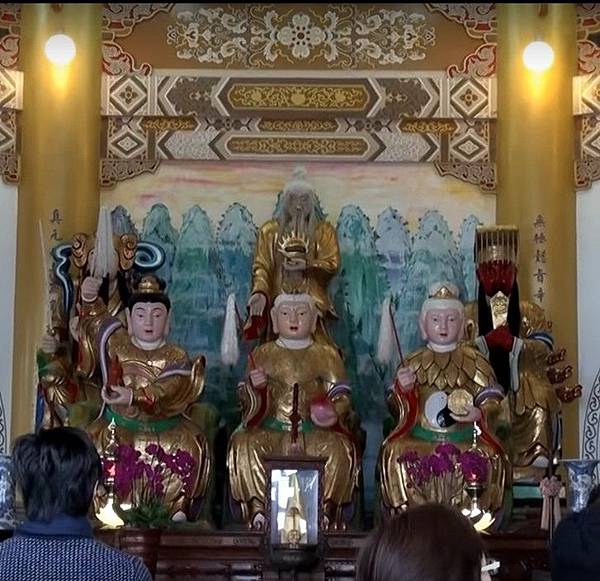 在每層聖殿之龍柱與龍虎兩邊各有對聯,書刻著各殿神聖之聖務,第一層聖殿供奉:至聖先天聖祖無極至尊、南天玉皇大天尊玄靈高上帝、北極玄天上帝、瑤池金母大天尊、虛空地母大天尊、九天玄母大天尊、天父、地母、靈父、靈母、五十三單元總命旗,第二層聖殿供奉:無上三佛、無上佛、無上元、無上真,第三層聖殿供奉:無極金光玉皇大天尊、無極王天君、無極托塔天王、第四層聖殿供奉:無極五老中華帝君、東華帝君、西華聖母、南華帝君、北華帝君,第五層聖殿供奉:玄玄一炁、日、月、上清靈寶天尊、玉清元始天尊、太清道德天尊。