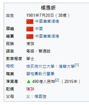 楊惠妍(1981年7月20日-)廣東順德人,香港上市公司碧桂園之大股東及董事局主席楊國強之第二女兒,美國俄亥俄州立大學市場及物流系畢業,文學士學位,清華五道口金融EMBA[3]。