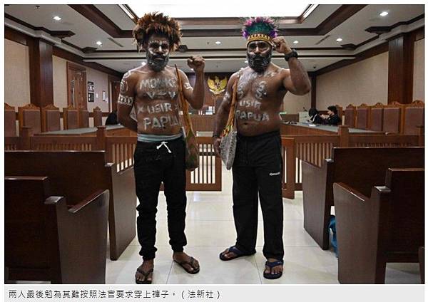 〔即時新聞/綜合報導〕印尼2名巴布亞活動分子去年8月在示威活動中升起象徵自由巴布亞運動旗幟「晨星旗」而遭警方逮捕,20日到雅加達的法院出席聽證會時,穿著傳統服飾「陰莖鞘」(koteka),被法官以不符合法庭上禮節為由拒絕審理,並要求他們拆除陰莖鞘穿上褲子後才願意進行聽證會,這2名男子批評此舉是「種族主義」。
